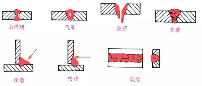 由于焊接中的各種缺陷(見下圖)以及焊縫熱影響區(qū)組織的變化,焊接的測試尤為重要。