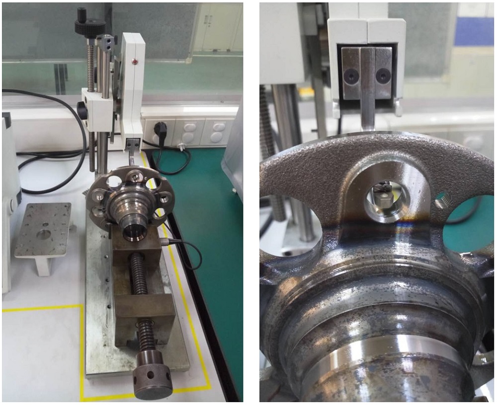 汽車上的軸承多種多樣,對各個部件的要求的也都十分嚴格。因為某一個部件一點小的性能差別都可能造成可靠隱患。 汽車軸承上的一些固定的用的螺栓孔也是非常重要的,不僅要求孔的尺寸和定位精度,同時對加工時的質量也有很高的要求。要求孔在加工的過程中不能產生加工硬化,以免對整個零件的長期穩定性產生影響。那么檢查是否有加工硬化產生又能不破壞零件,好的辦法就是采用小載荷的維氏硬度檢測。但是由于孔洞的尺寸一般只有十幾個毫米,想要進行維氏硬度測試是很難實現的。 恩斯特的MTR硬度計就能很好的解決孔洞內側硬度測試的難題。