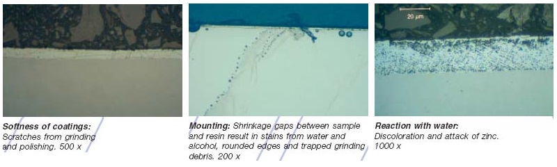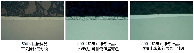因?yàn)殄冧\層的制備工藝方法不同,鍍鋅層的硬度和厚度變化很大,對(duì)金相試樣的制備要求是不同的。制備過(guò)程中,鋅與水的反應(yīng)帶來(lái)額外的困難。