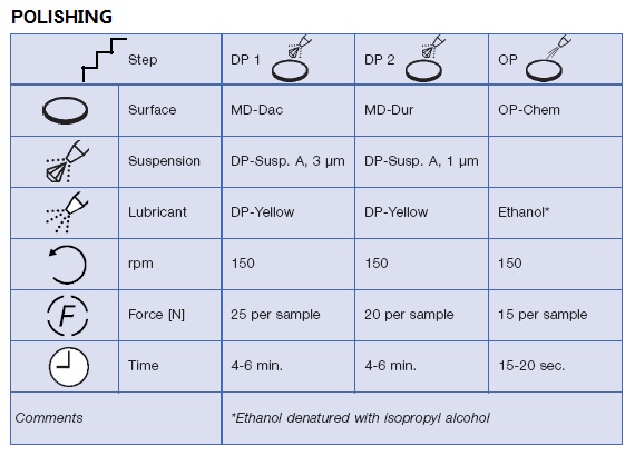 ●? 清洗用添加異丙醇的酒精在MDChem拋光布短暫輕拋,再漂洗和干燥,效果很好。如果使用自動(dòng)加料磨拋系統(tǒng),可用大劑量的無(wú)水潤(rùn)滑劑,拋光數(shù)秒鐘,可以使隨后清洗方便。