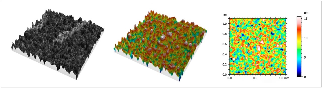 電子設備:(左圖)疊加真彩紋理的三維視圖;(中圖)用 10×/0.4 物鏡創建的高度圖;(右圖)用于測量區域粗糙度或紋理的二維高度圖,例如用于質量控制或確定假冒電子設備。