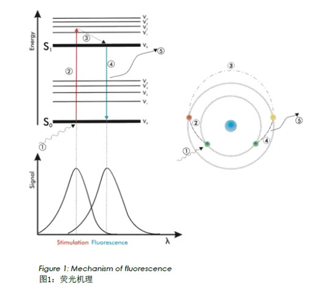 熒光是一種發光形式,指在原子或分子激發后發光。在光子發射(光)的情況下,它被稱為光致發光。熒光機理如圖1所示。為了激發熒光,采用紫外光源照射待測件表面。待測件表面上的污染物吸收高能量輻射(1)。 受光子激發,污染物的電子達到更高的能級(2)激發態。激發的分子與其環境碰撞并釋放一小部分吸收的能量(3)。剩余能量作為發射(4)進行釋放,并且電子從激發態返回到其起初狀態。發射的光子能量較低,因此釋放了長波(5)。