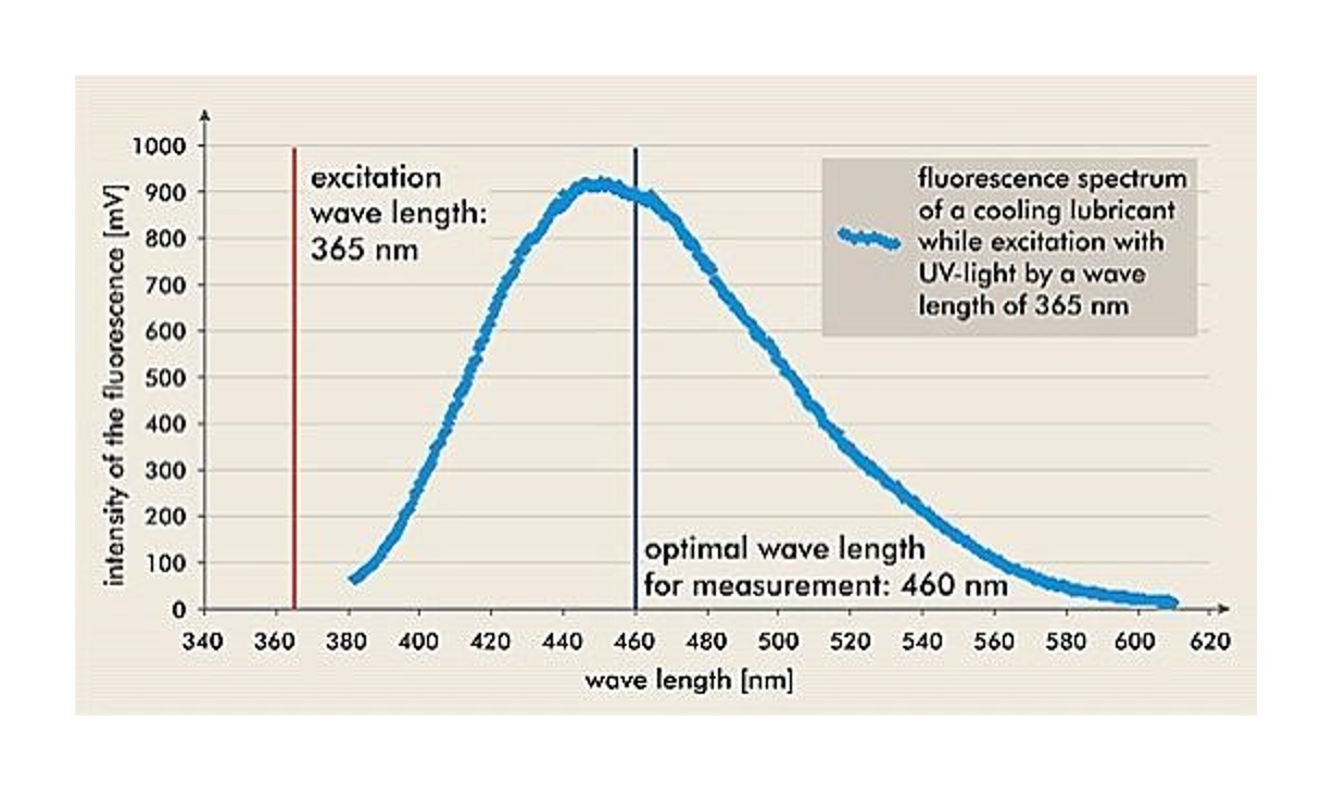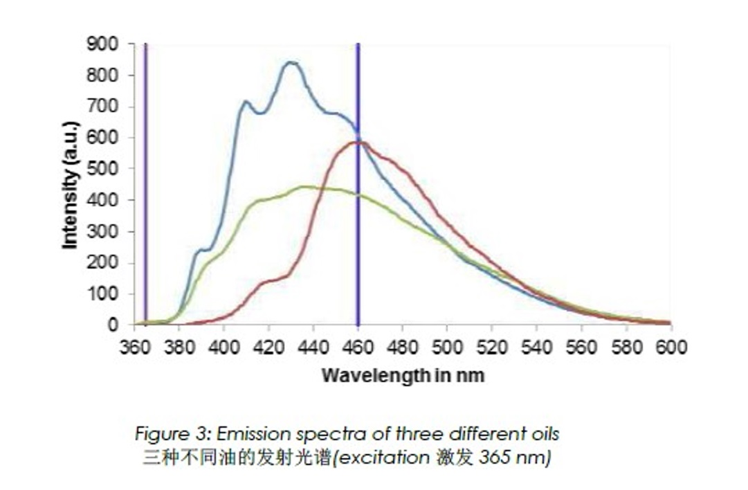 上圖是冷卻潤滑油和其他三種不同油在365nm波長下激發的熒光光譜圖。由于它們都在460nm波長下的熒光強度很強,同意檢測出熒光值,因此析塔SITA表面清潔度測量儀采用在此波長下檢測污染物的含量。